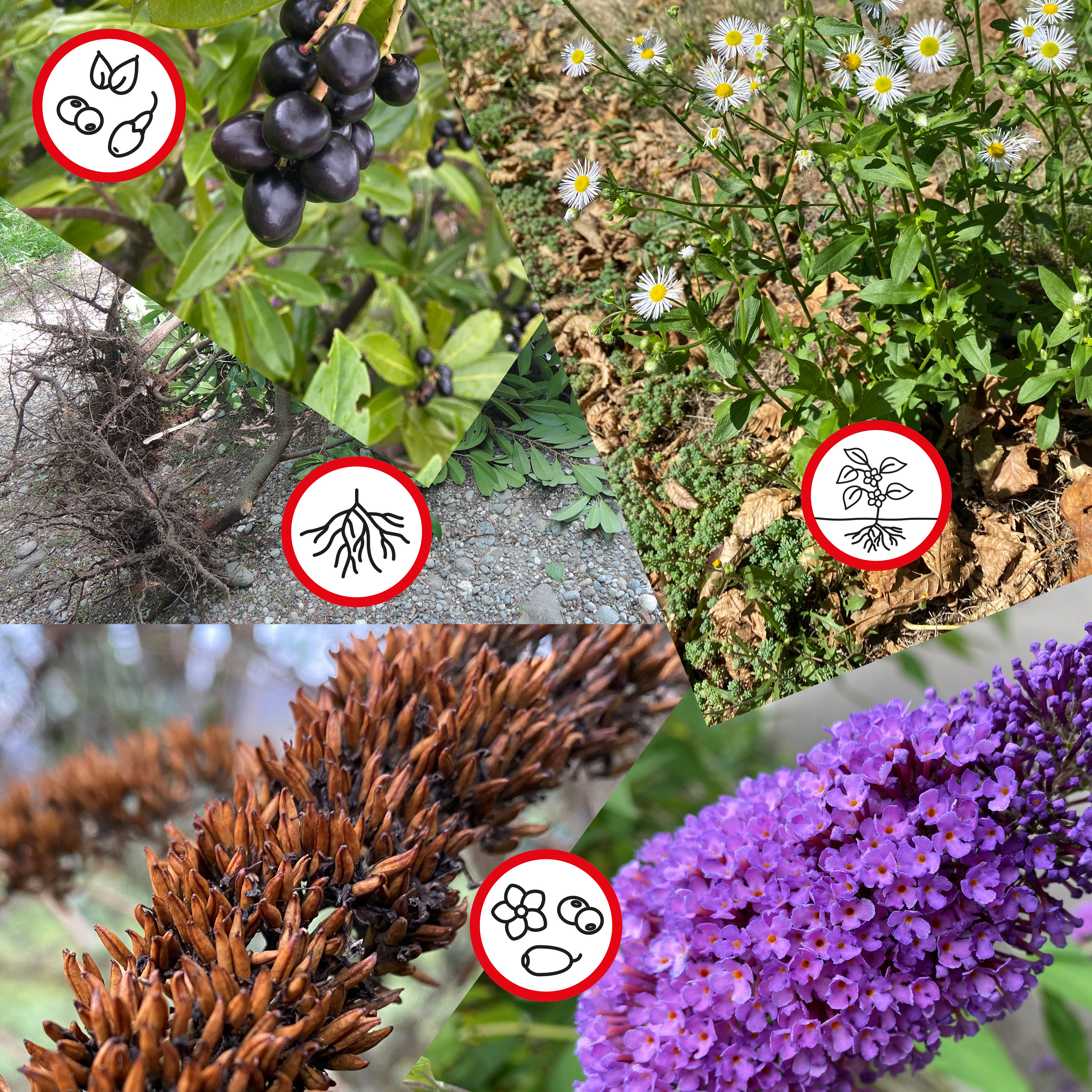 Im Neophytensack werden alle Pflanzenteile entsorgt, aus denen neue Pflanzen entstehen können - somit alle fortpflanzungsfähigen Teile. Beim Sommerflieder sollten Sie deshalb verblühte Blüten und Samenstände abschneiden und im Neophytensack entsorgen. Auch Wurzelstücke oder Früchte des Kirschlorbeers können neue Pflanzen bilden und gehören daher in den Sack. Das übrige Pflanzenmaterial von Sommerflieder und Kirschlorbeer darf über die Grünabfuhr entsorgt werden. Bei krautigen Arten wie dem Einjährigen Berufkraut oder dem Schmalblättrigen Greiskraut sind die Samen und Wurzeln fortpflanzungsfähig. Aus praktischen Gründen empfehlen wir, die ganze Pflanze im Neophytensack zu entsorgen.